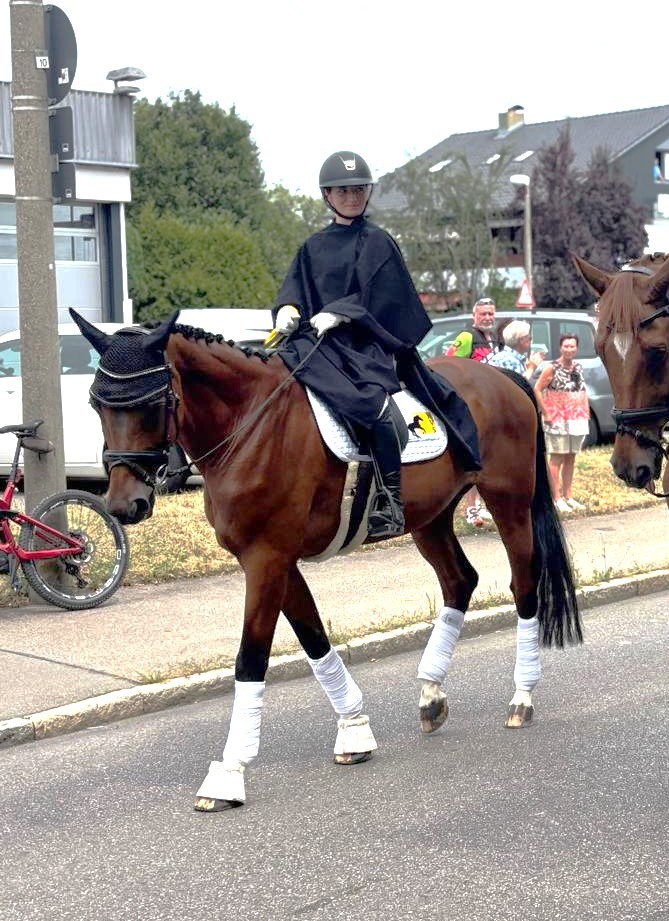 Ich bin ein super erfahrenes Springpferd und eine coole Socke, zwar schon etwas älter, aber auf mir kann man auf jeden Fall eine ganze Menge lernen! Hier bin ich mit Hanna beim Festumzug in Maichingen.